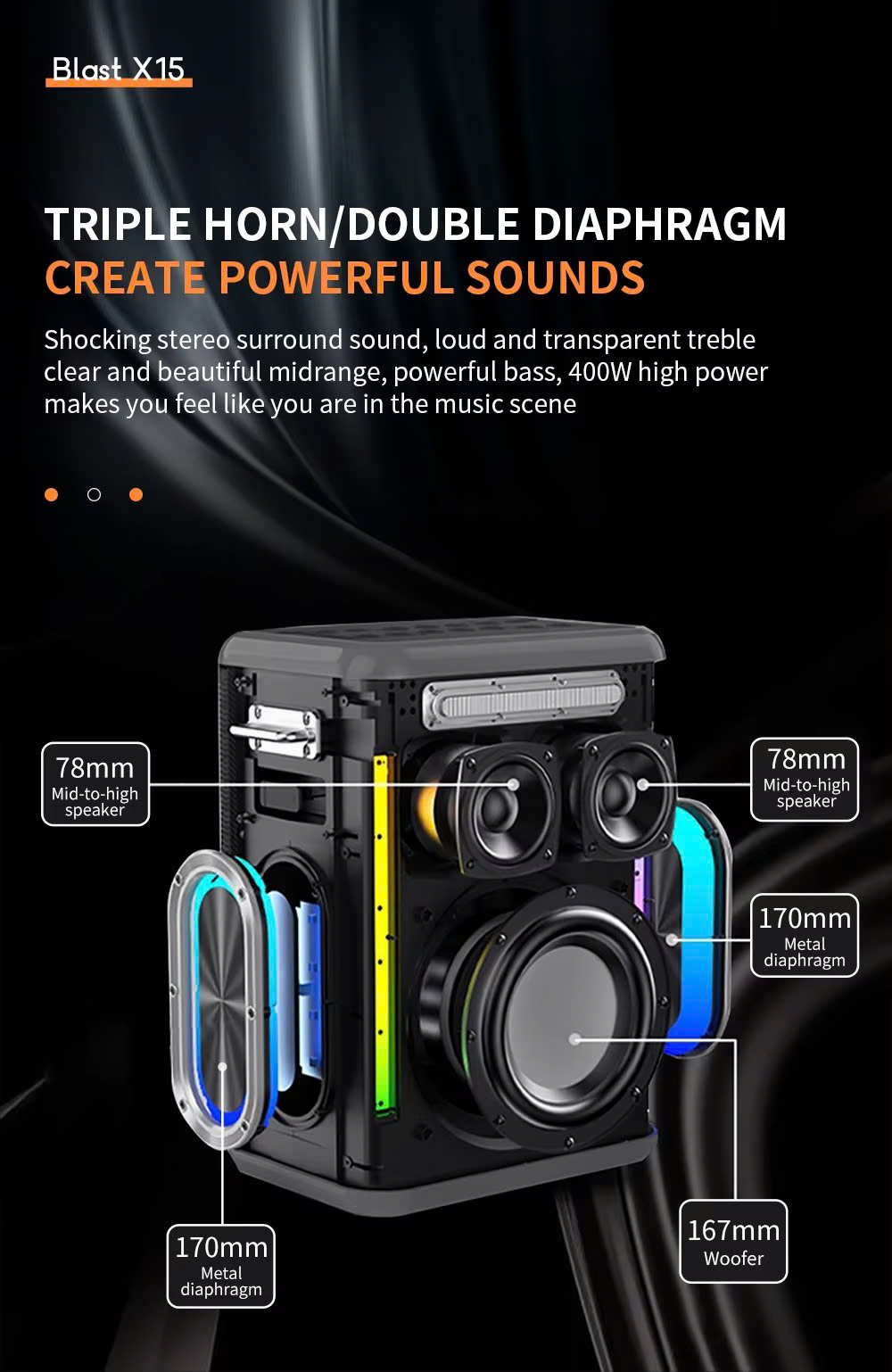- Âm thanh mạnh mẽ với công suất lớn: Được trang bị hệ thống âm thanh công suất cao, mang lại trải nghiệm âm thanh sống động, rõ nét, từ âm trầm sâu đến âm cao trong trẻo.