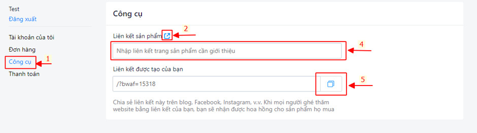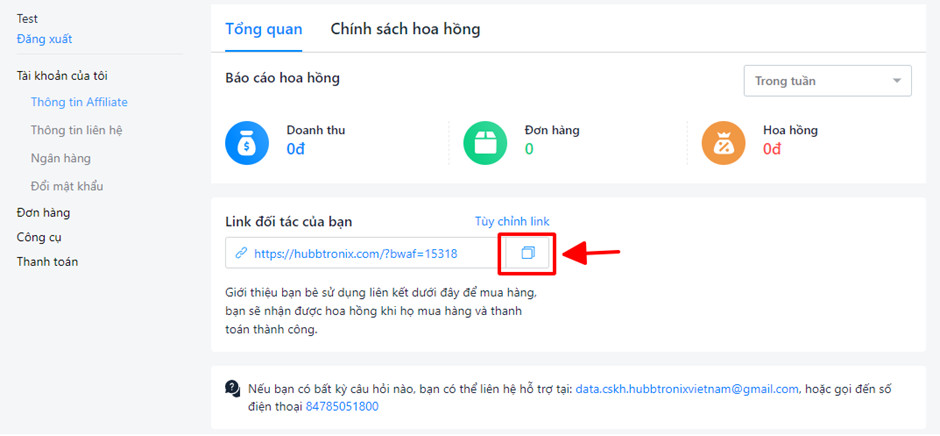 Trên giao diện Thông tin Affiliate đối tác copy link Affiliate để gửi tới các khách mua hàng tiềm năng.