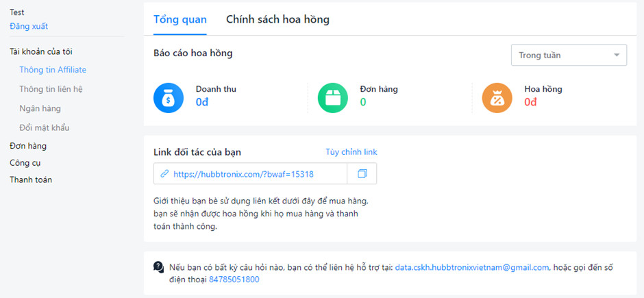 Sau khi đăng ký tham gia thành công, tài khoản đối tác sẽ chuyển về giao diện Thông tin Đối tác tiếp thị online trên website chính hãng HUBBTRONIX.