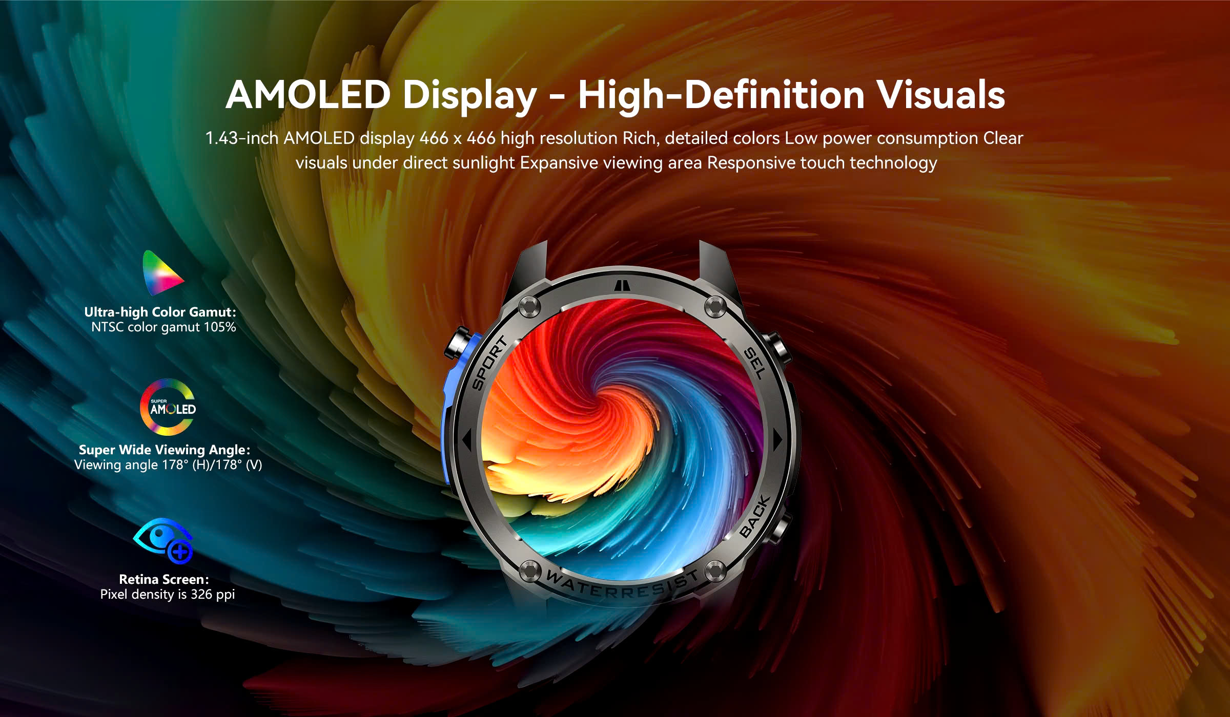 - Màn hình AMOLED 1.43 inch với độ phân giải 466x466 mang đến hiển thị sắc nét và màu sắc sống động. Bạn sẽ dễ dàng theo dõi các thông số và thông báo ngay cả dưới ánh sáng mặt trời.