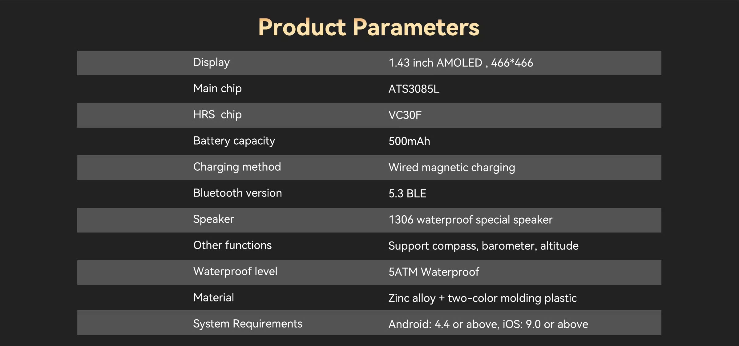 - Màn hình: AMOLED 1.43 inch, độ phân giải 466x466.