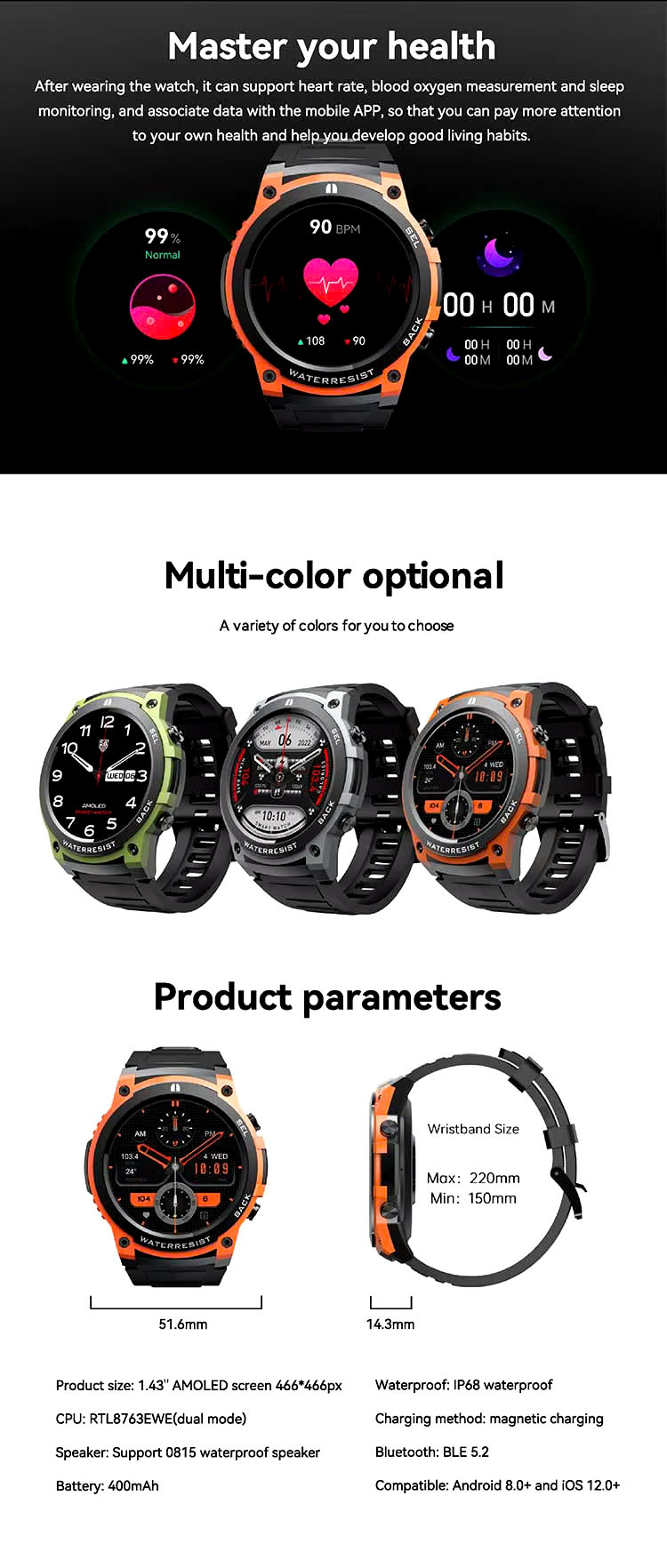 - Theo dõi nhịp tim,Theo dõi huyết áp và Nồng độ oxy trong máu 24/7.