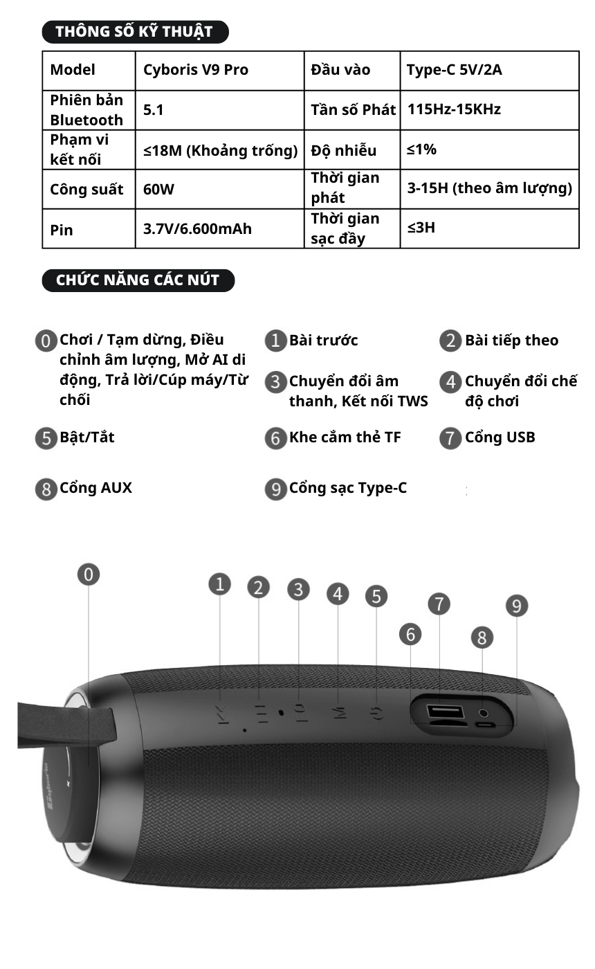 * Ngoài ra, Cyboris V9 Pro còn có khe cắm thẻ, cho phép bạn phát nhạc trực tiếp từ thẻ micro SD của mình. Tính năng này hoàn hảo cho những lúc bạn không có quyền truy cập vào điện thoại hoặc khi bạn muốn tiết kiệm pin.