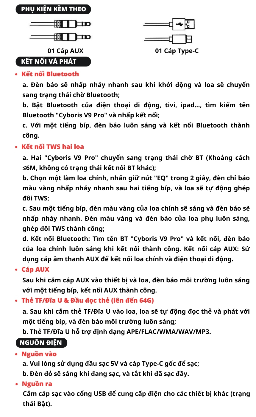 * Khách hàng có thể Tham khảo thêm tính năng, video hướng dẫn cài đặt, sử dụng bằng cách Quét mã QR Hướng dẫn trên Thẻ sản phẩm để xem các video hướng dẫn. Ngoài ra, khách hàng có thể truy cập vào kho âm nhạc chất lượng cao tại đường dẫn : (www.Youtube.com/CyborisVietnam/Playlist.....) để thưởng thức nhiều Playlist âm nhạc theo nhiều chủ đề để thưởng thức âm nhạc và khám phá Âm thanh tuyệt vời cùng Loa Siêu Bass Cyboris – V9 PRO.