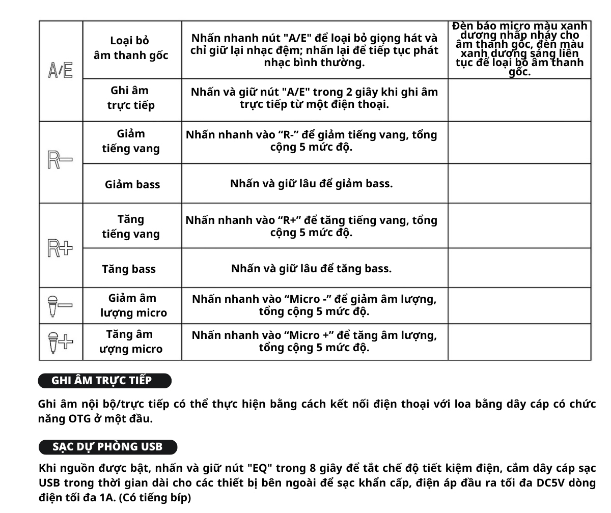 • USB Output: 5V/0.5A (sạc cho thiết bị khác)