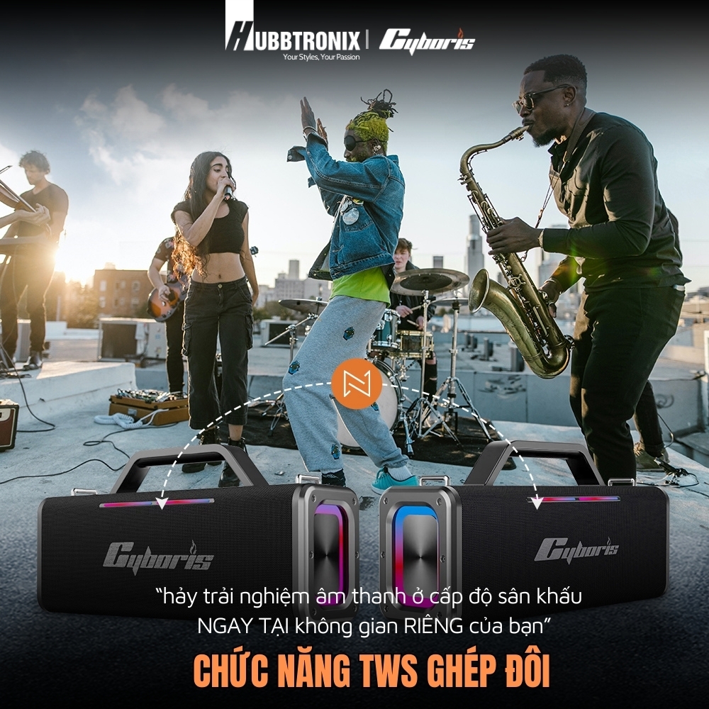 Loa Cyboris X12 được trang bị Bluetooth 5.3 với khả năng truyền tải nhanh và tín hiệu ổn định. Tính năng TWS (True Wireless Stereo) cho phép ghép nối hai loa cùng lúc, tạo ra âm thanh nổi 3D bao trùm không gian. Pin dung lượng 18,000mAh giúp bạn thưởng thức nhạc liên tục suốt 12 giờ, đồng thời loa còn có thể sạc các thiết bị khác qua cổng USB.