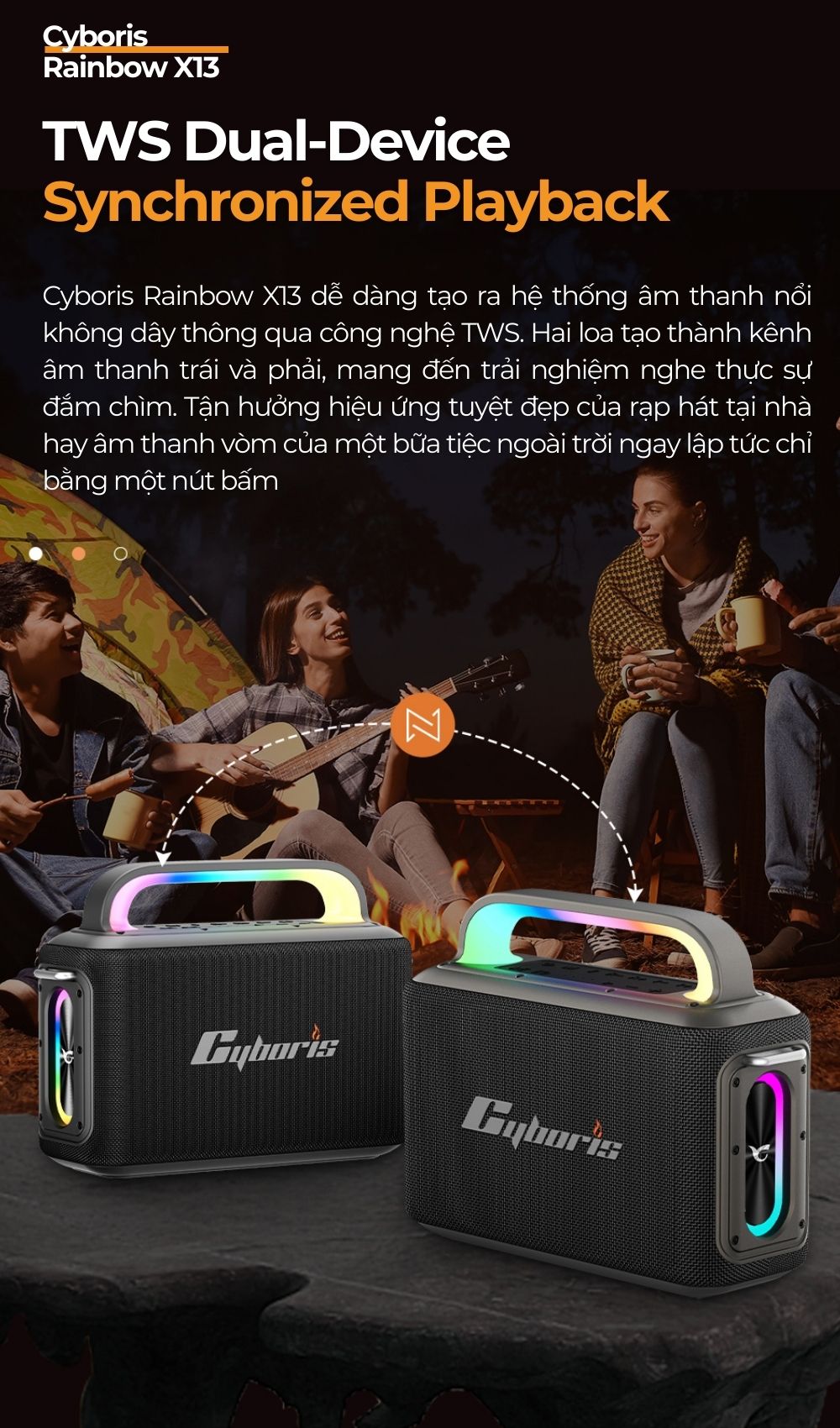 Hãy tưởng tượng một buổi tối cuối tuần, bạn bè và gia đình quây quần, cùng nhau cất lên những giai điệu yêu thích với chất âm sống động và ánh sáng rực rỡ. Hoặc một chuyến dã ngoại ngập tràn tiếng cười với âm nhạc khuấy động không gian. Tất cả đều trở nên tuyệt vời hơn với Cyboris Rainbow X13 – không chỉ là một chiếc loa, mà là một trung tâm giải trí di động mạnh mẽ, sẵn sàng đồng hành cùng bạn trong mọi khoảnh khắc.