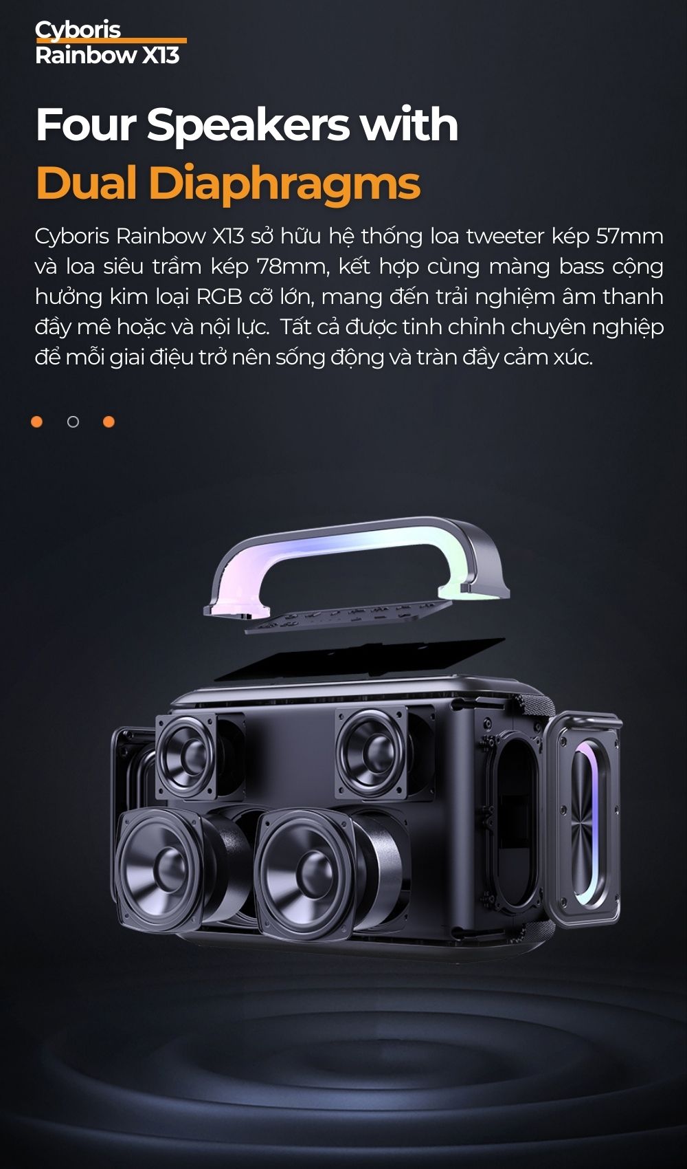 Công suất 100W Bùng Nổ: Được trang bị hệ thống 4 loa tiên tiến, bao gồm 2 loa tweeter 57mm cho âm cao trong trẻo và 2 loa bass 78mm kết hợp màng loa cộng hưởng thụ động kép, Cyboris Rainbow X13 tái tạo dải âm rộng, từ những nốt trầm sâu lắng đến những âm cao tinh tế.
