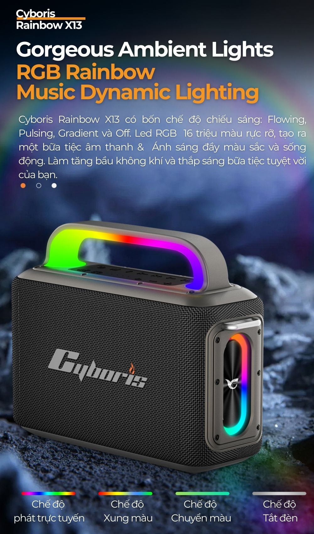 Đèn LED RGB Động Theo Nhạc: Cyboris Rainbow X13 không chỉ chinh phục bằng âm thanh mà còn bằng ánh sáng. Hệ thống đèn LED RGB ở mặt trước và hai bên hông loa nhấp nháy, chuyển màu theo từng giai điệu, tạo nên một bữa tiệc thị giác đầy màu sắc.