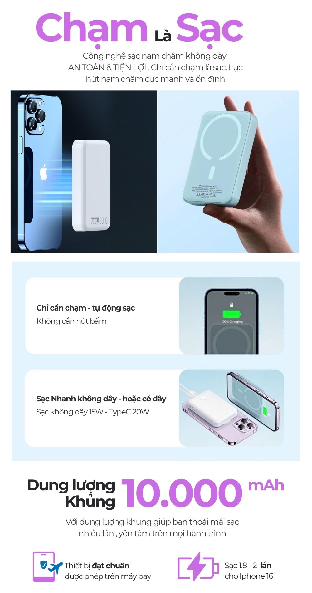 ✔️ Chạm Là Sạc - Sạc không dây từ tính tiện lợi, chỉ cần chạm là sạc.