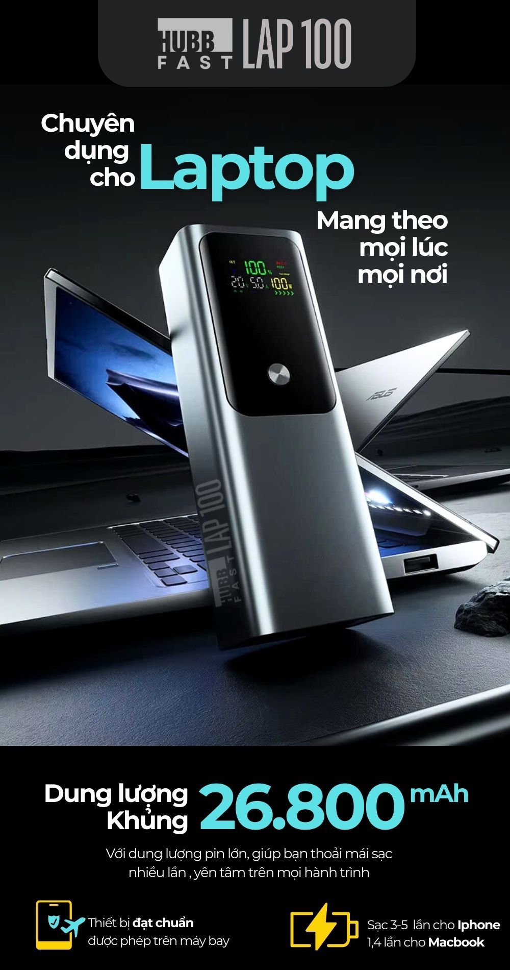 ✔️ Dung lượng khủng 26.800mAh: Đủ năng lượng cho nhiều lần sạc đầy các thiết bị.