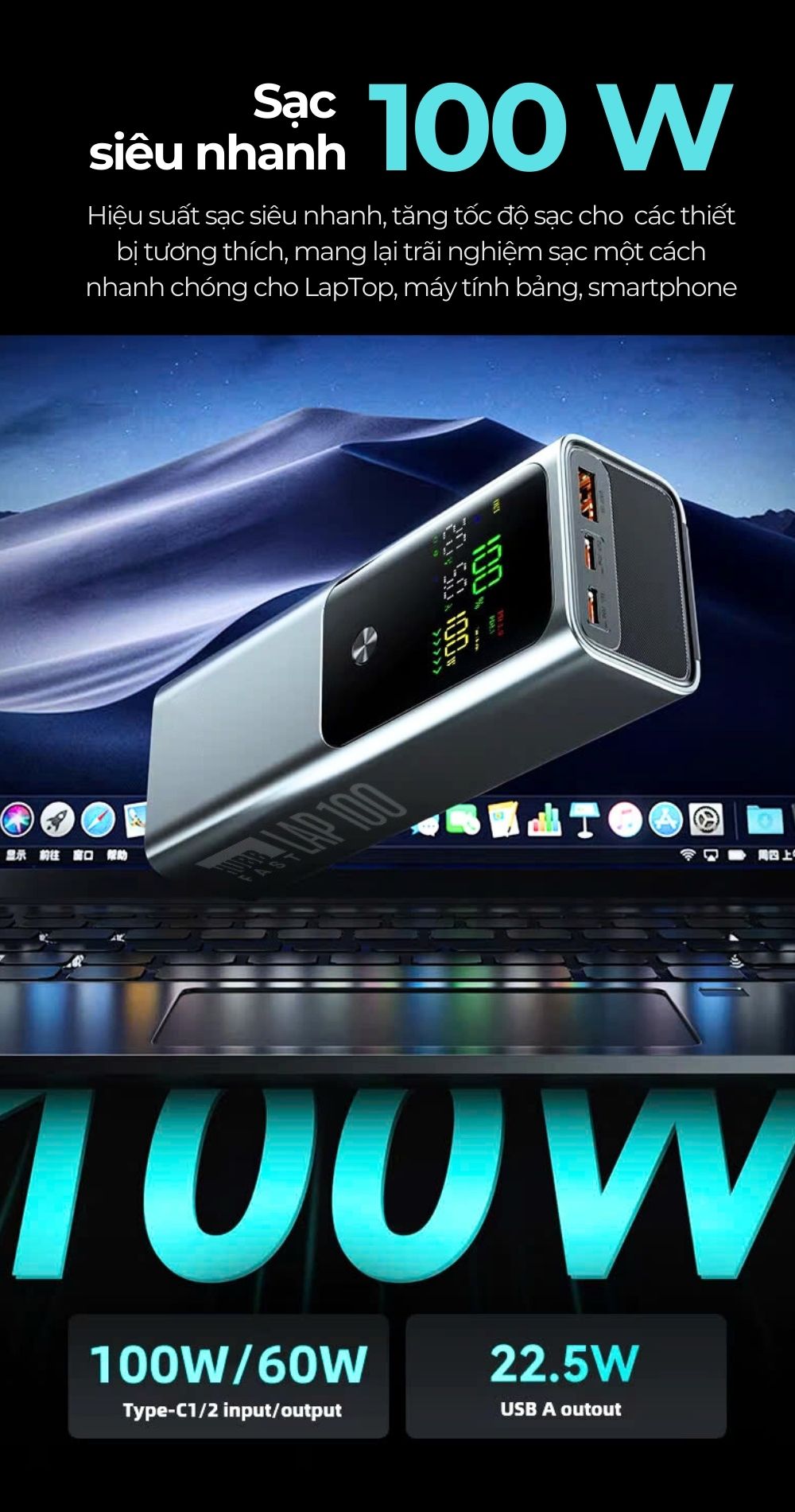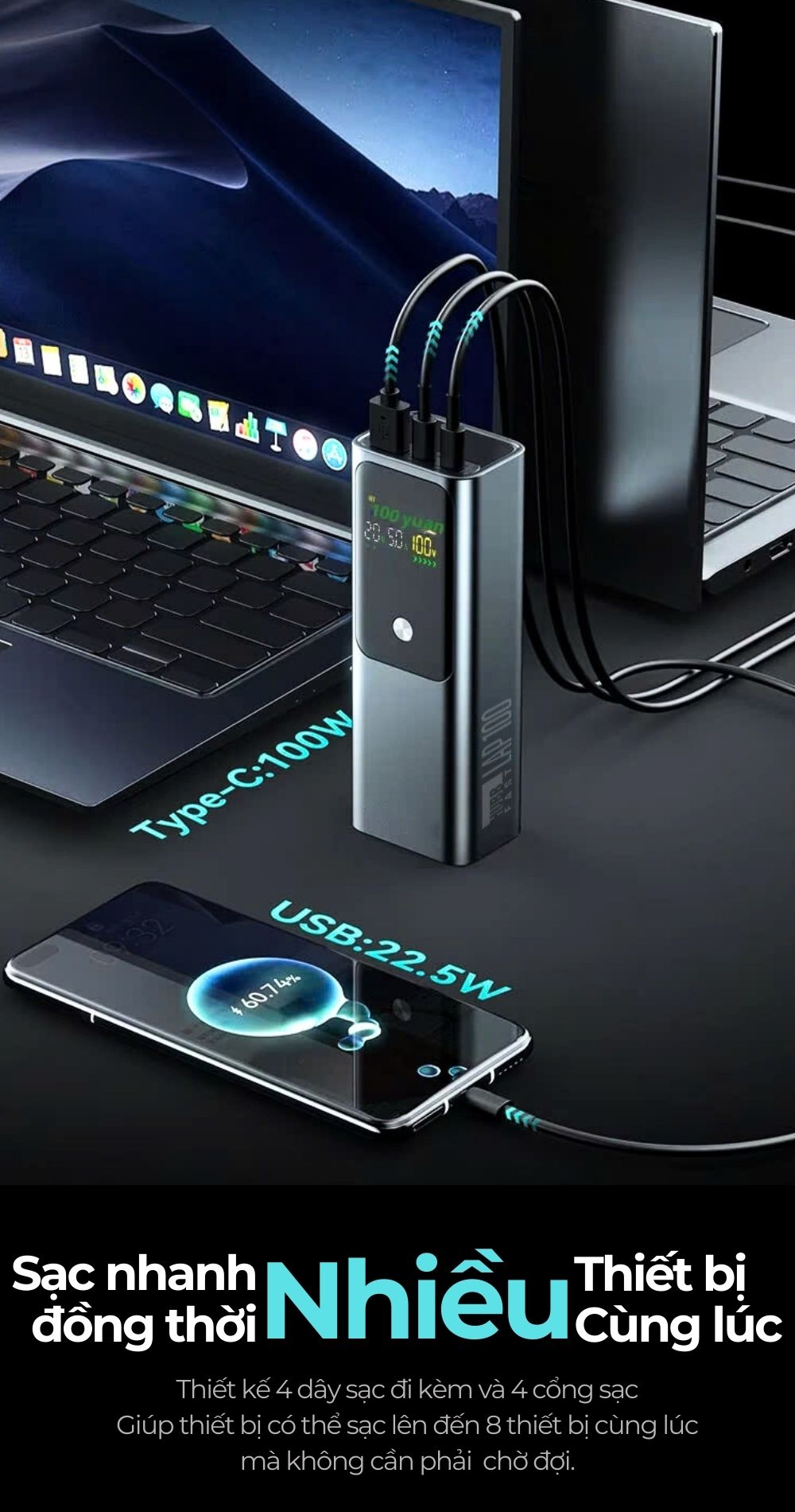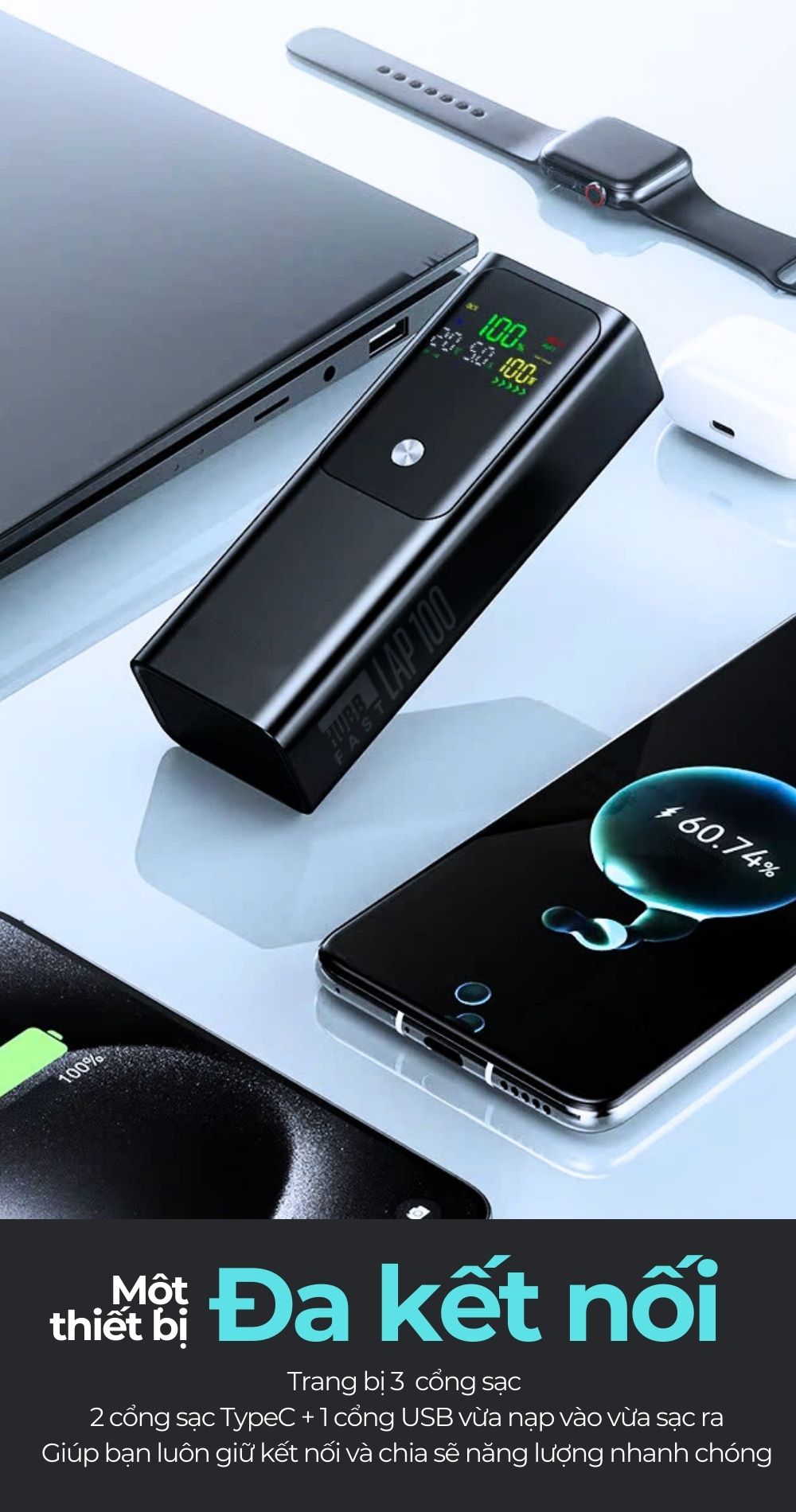 ✔️ Sạc siêu nhanh 100W: Rút ngắn tối đa thời gian sạc cho cả laptop và các thiết bị di động khác.