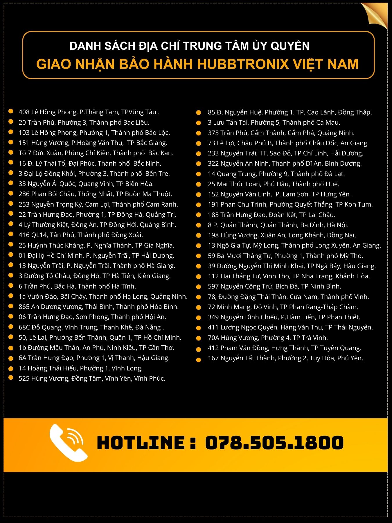 Tất cả các sản phẩm mang thương hiệu HUBBTRONIX đều được bảo hành chính hãng toàn quốc. Khi phát sinh yêu cầu bảo hành, quý khách liên hệ hotline 078.505.1800 để được hướng dẫn bảo hành.
